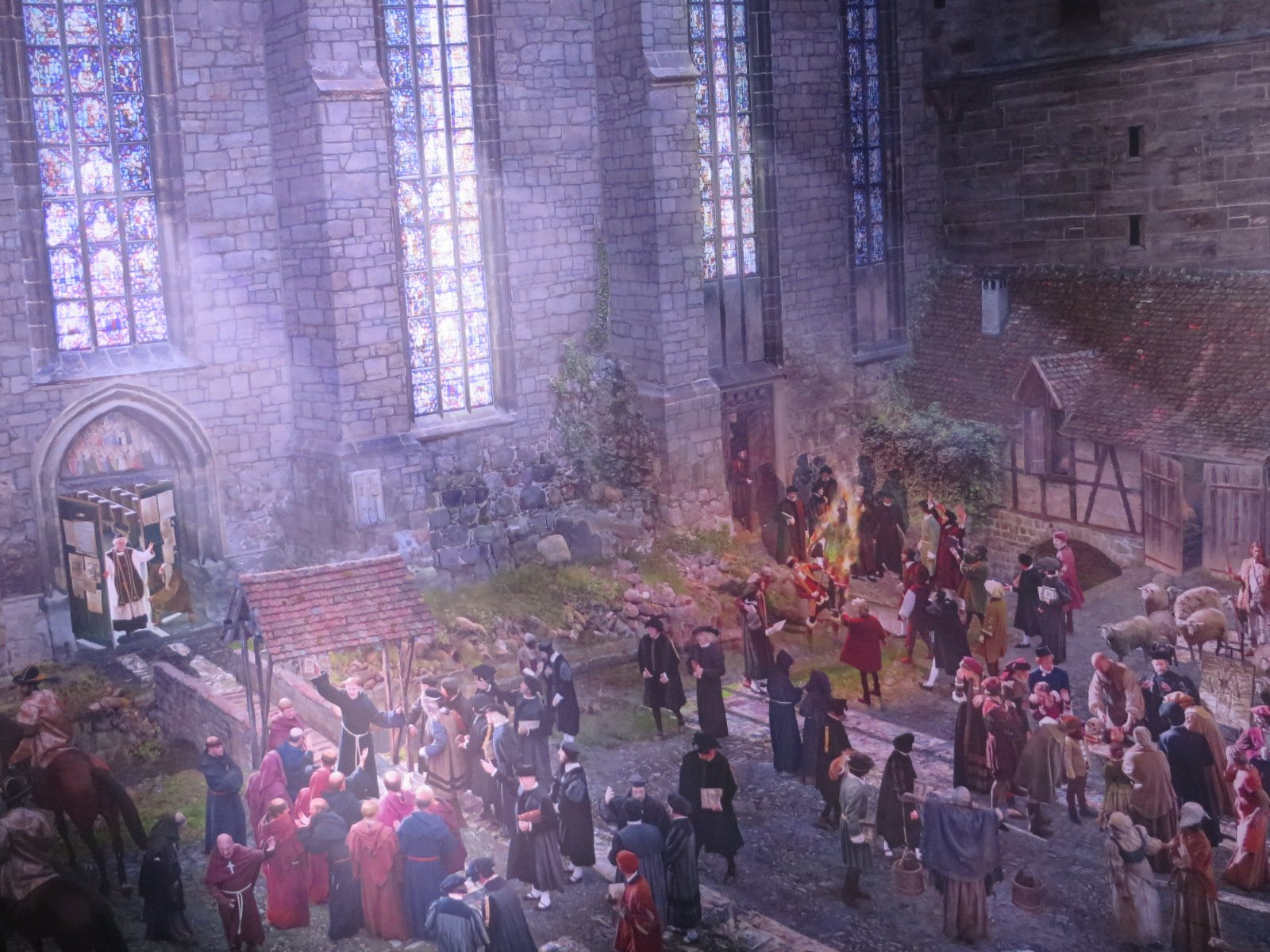 Hier steht Martin Luther vor der Schlosskirche und wettert dagegen. Mit all den Bildern, Lichtern und Geräuschen hat mich das Panorama unglaublich fasziniert. Ich habe es mir eine Stunde lang angesehen.