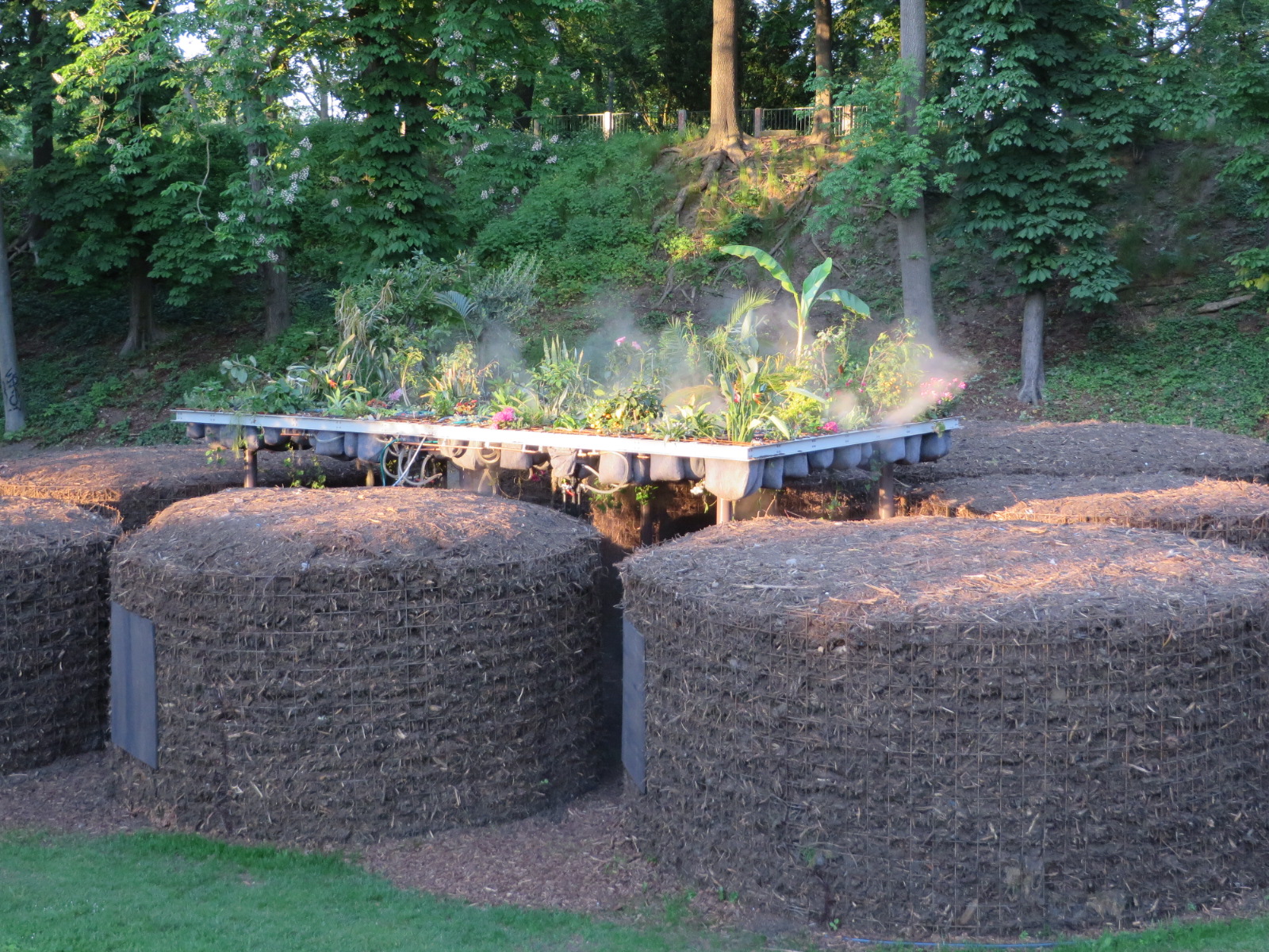 Der Paradiesgarten. Die Erneuerung des Lebens durch die Kompostwälle, die warmes Wasser erzeugen für die Pflanzen.