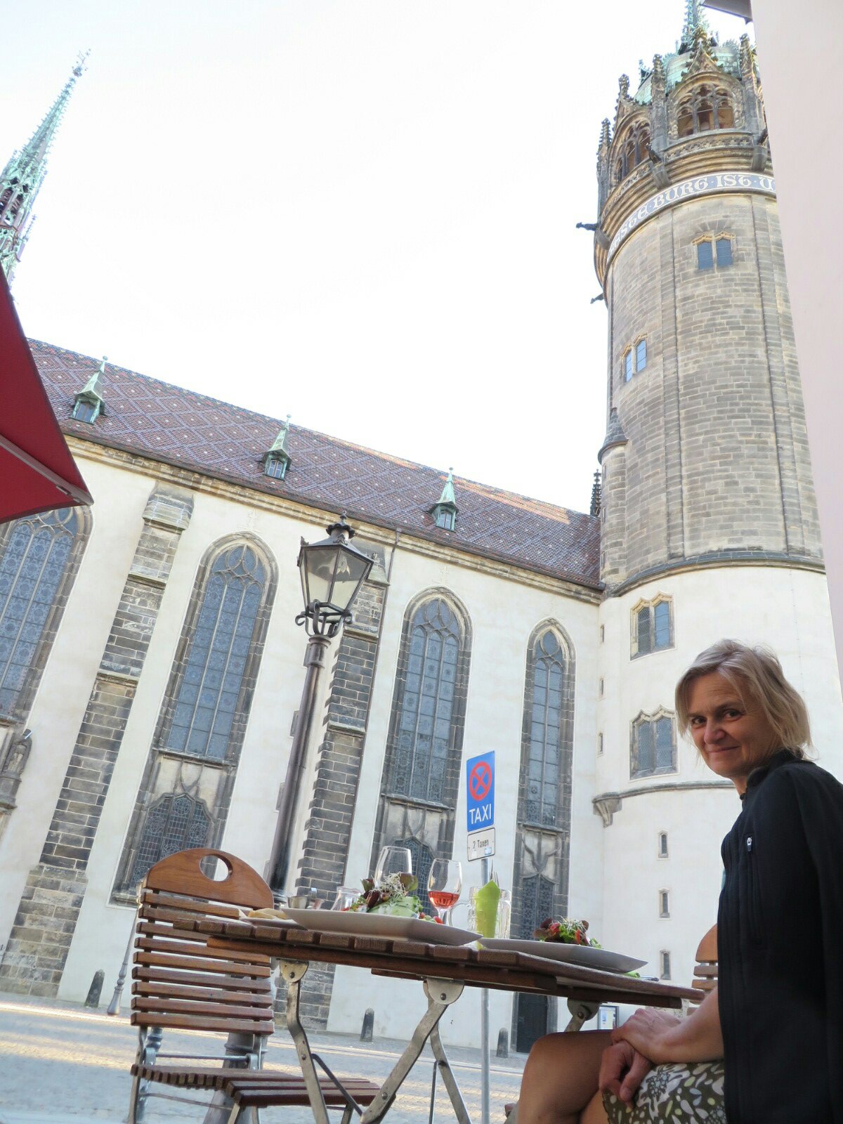 Was für ein Tag! So unglaublich viele Eindrücke und Impulse. Am Abend saßen wir schließlich vor der Schlosskirche beim Essen und einem Glas Wein.