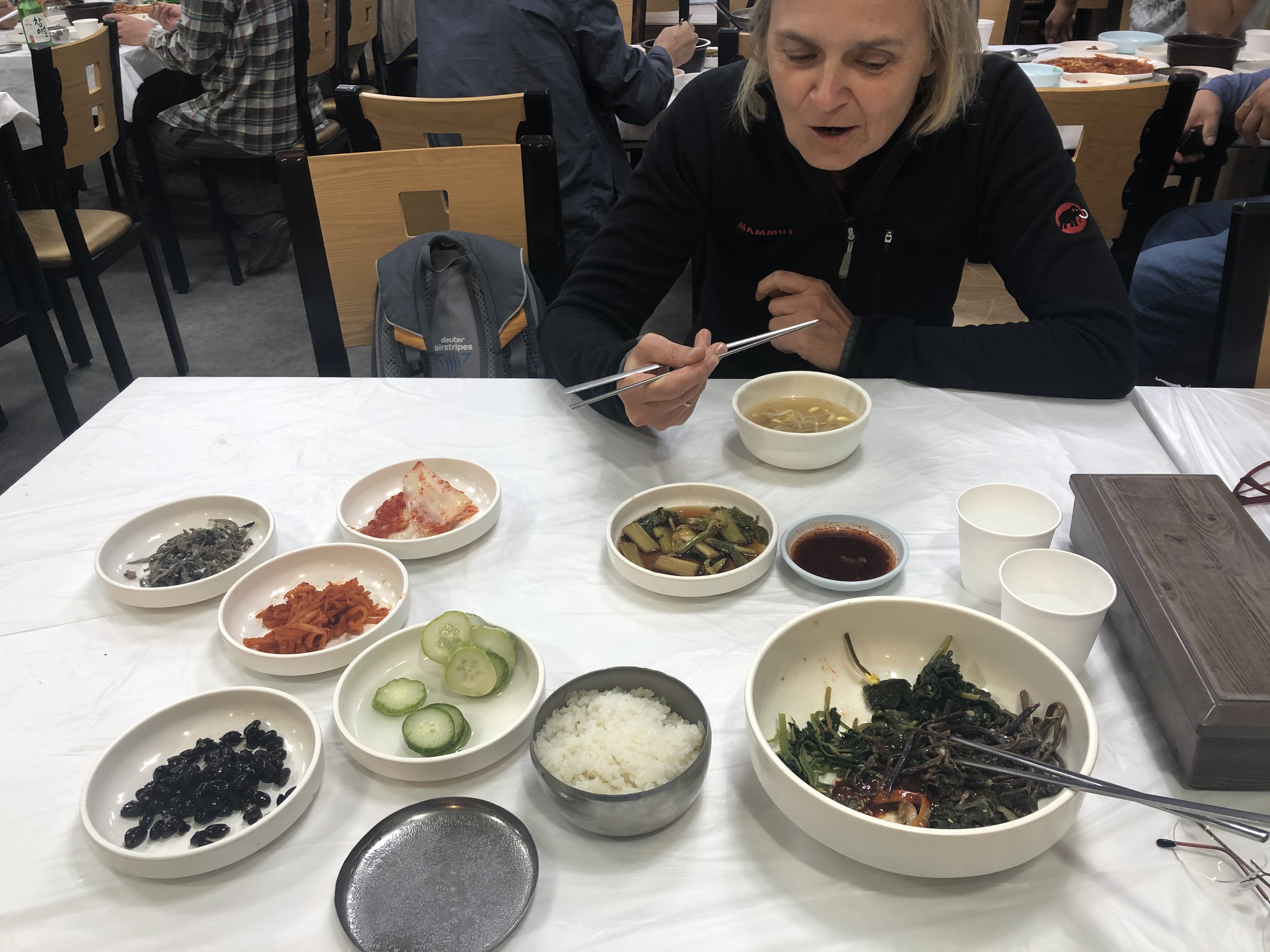 Zum Abendessen gab es Bibimbap mit Wildgemüse. Außer dem Reis (und dem Spiegelei, das vorher drauf lag) ist alles kalt. In den Schälchen sind Sojasprossen, eingelegter Bleichsellerie, Kimchi (eingelegter Chinakohl, gibt es zu jedem Essen), eingelegter Rettich, kleine Fischchen (links außen), schwarze Bohnen oder Kerne (keine Ahnung was das war), Gurken (ganz normale), Reis, Sojasoße und in der großen Schüssel verschiedenes Unbekannte.