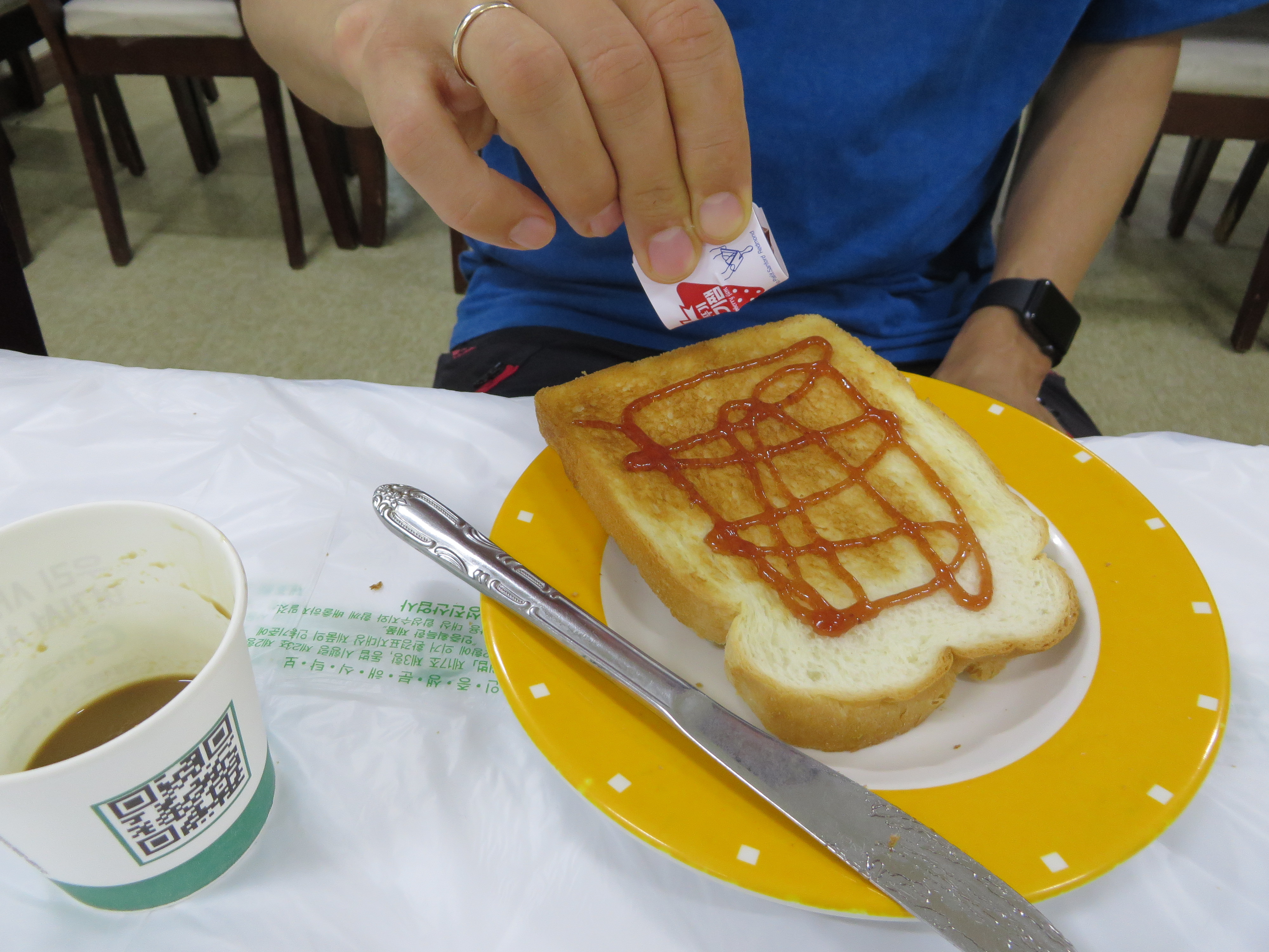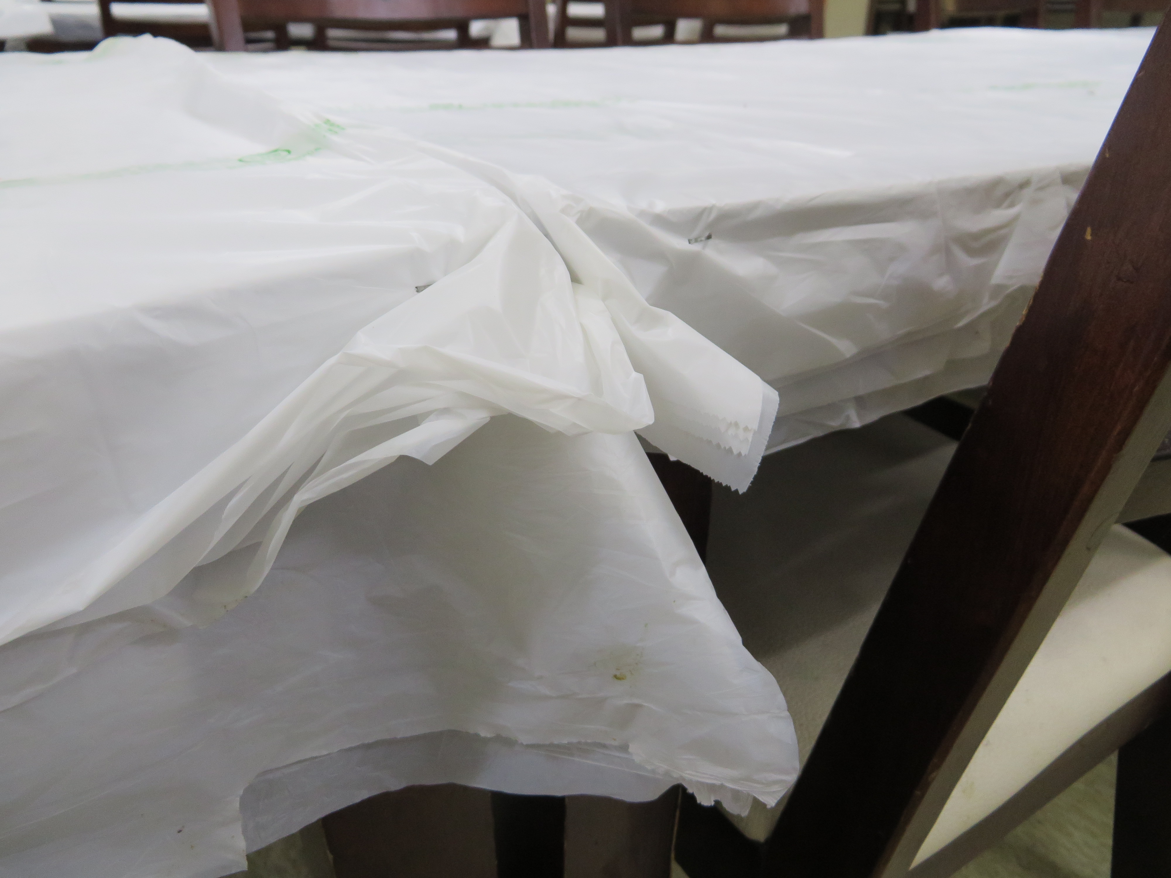 Die Tischdecke scheint ein Patent dieser Gegend zu sein. Haben wir gestern Abend schon gesehen. Ist ziemlich praktisch. Mehrere Lagen Folie werden übereinander an den Tisch getackert. Nach dem Essen wird einfach die oberste Folie abgerissen.