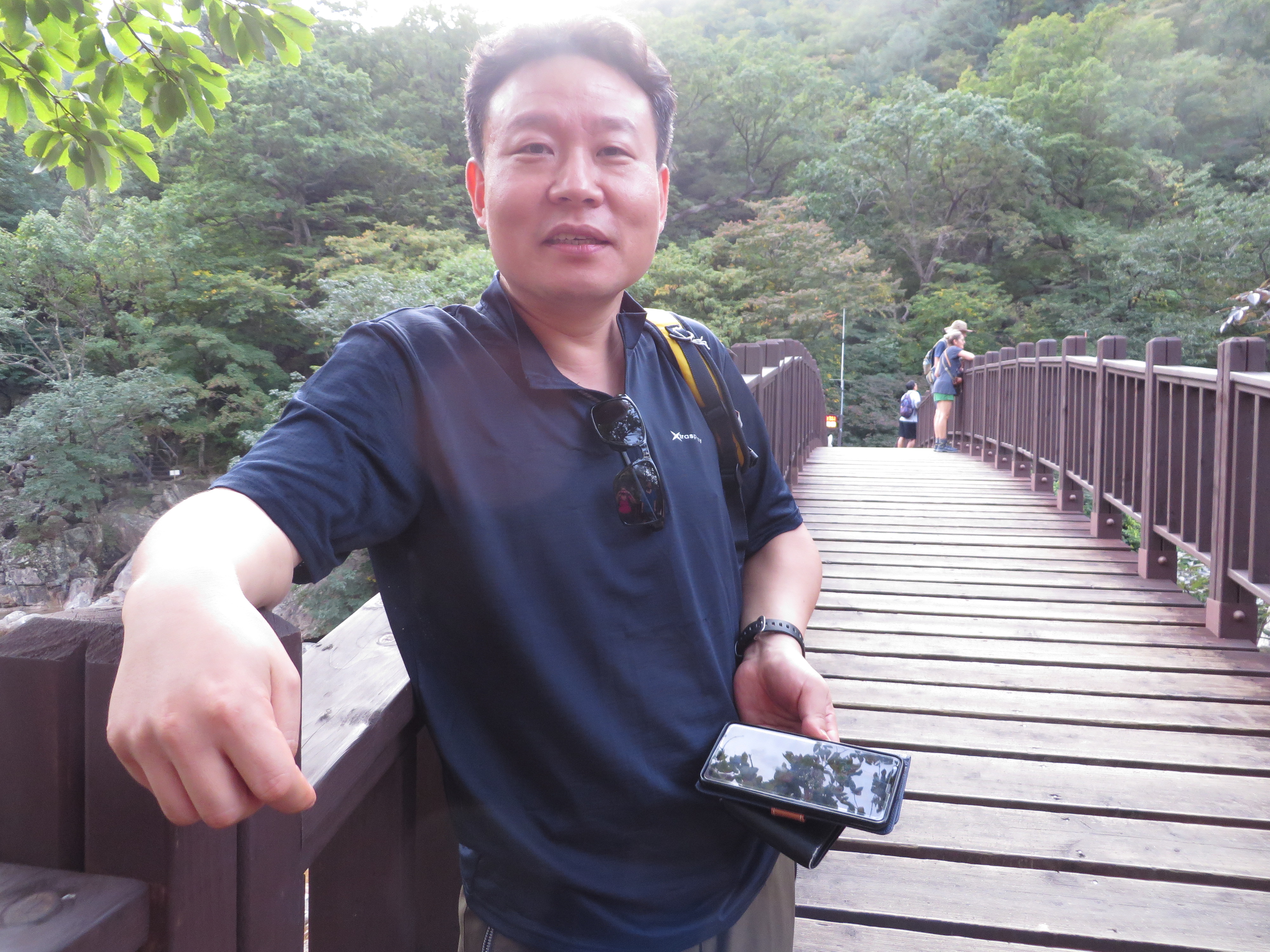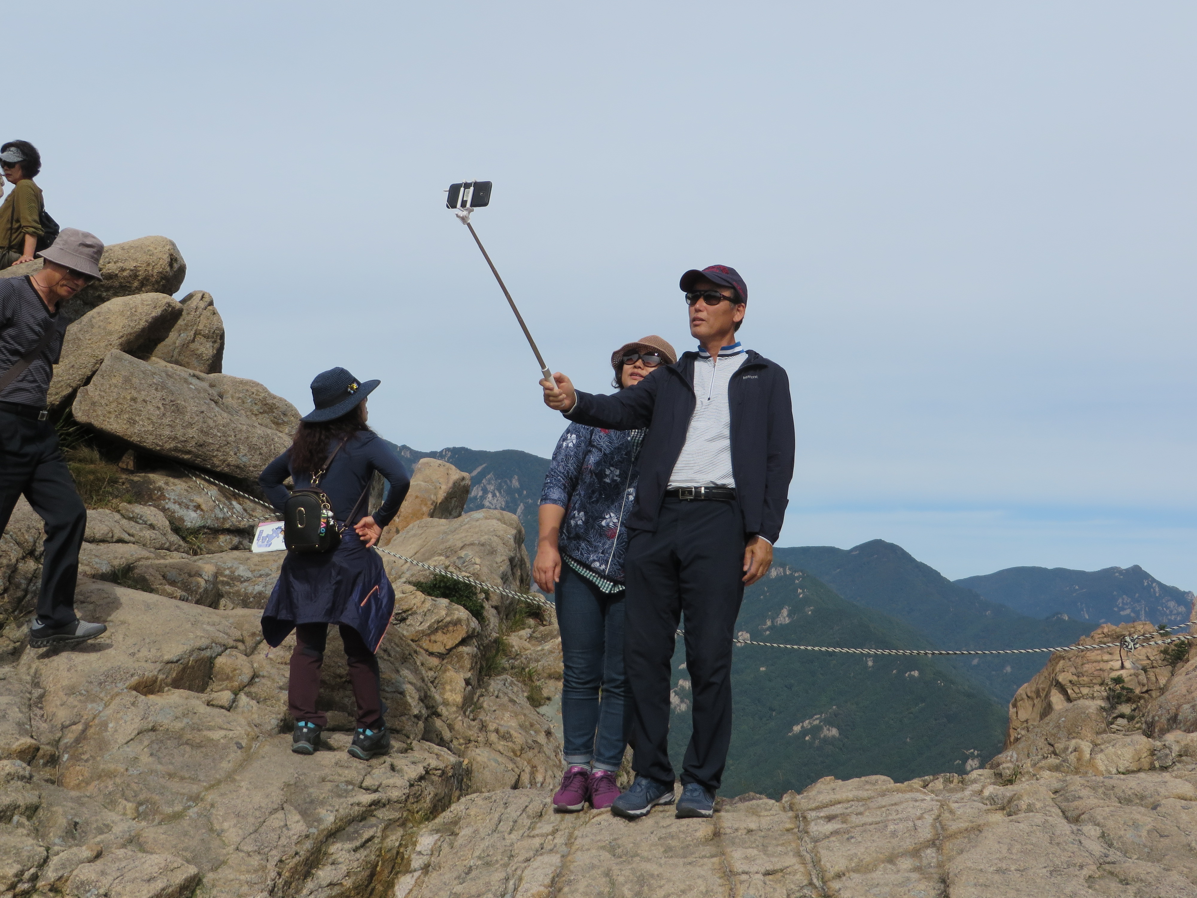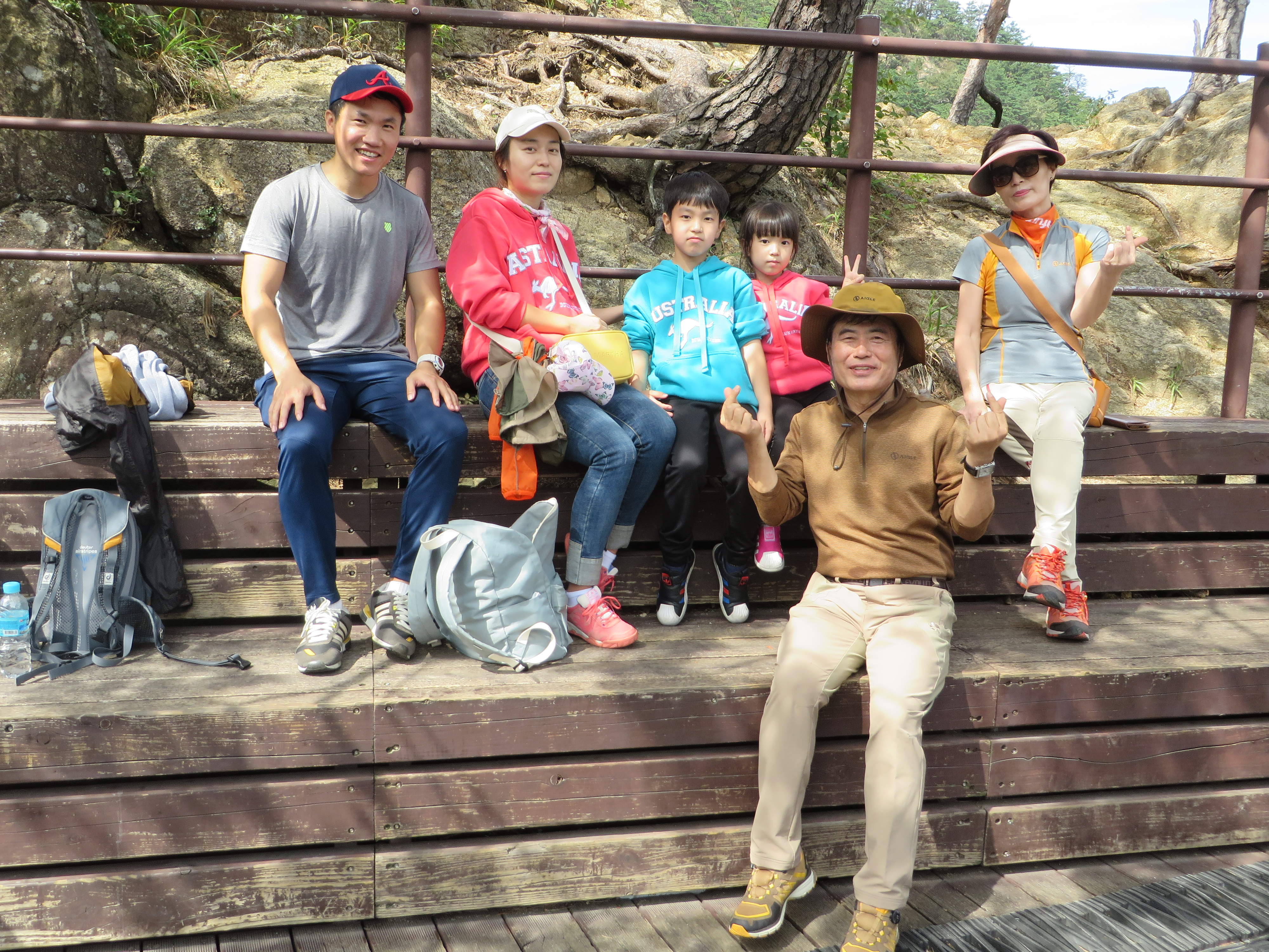 Was ich euch aber unbedingt noch erzählen möchte: Wir haben heute unglaublich viele Leute getroffen. Ein Paar aus Berlin, eine Familie aus Frankreich, drei Wanderer aus Israel. Das ist einfach, denn sie alle sehen ja nicht asiatisch aus. Das funktioniert aber auch andersrum. Auch wir werden angesprochen und gefragt, woher wir kommen. Wenn wir dann sagen „Germany“ fangen die Koreaner an zu strahlen. Wir haben ein großes Ansehen hier. Ein Mann erzählte gleich stolz, dass er nächste Woche nach Deutschland fliegt. Auch München und Nürnberg stehen auf seinem Reiseplan. Er hatte seine ganze Familie dabei. Sein Vater und seine Frau zeigen auf dem Foto übrigens mit den Fingern ein altes koreanisches Freundschaftszeichen.