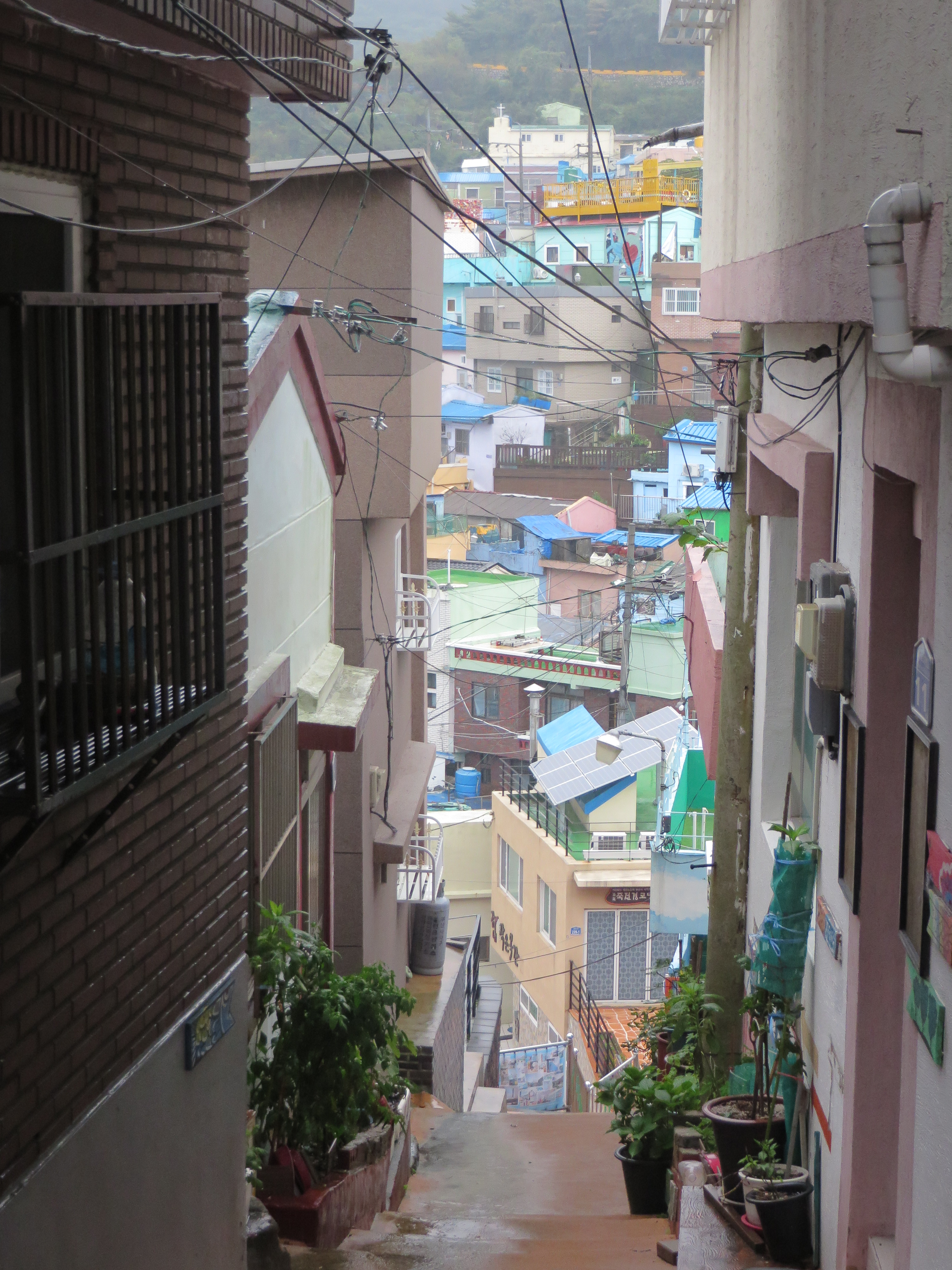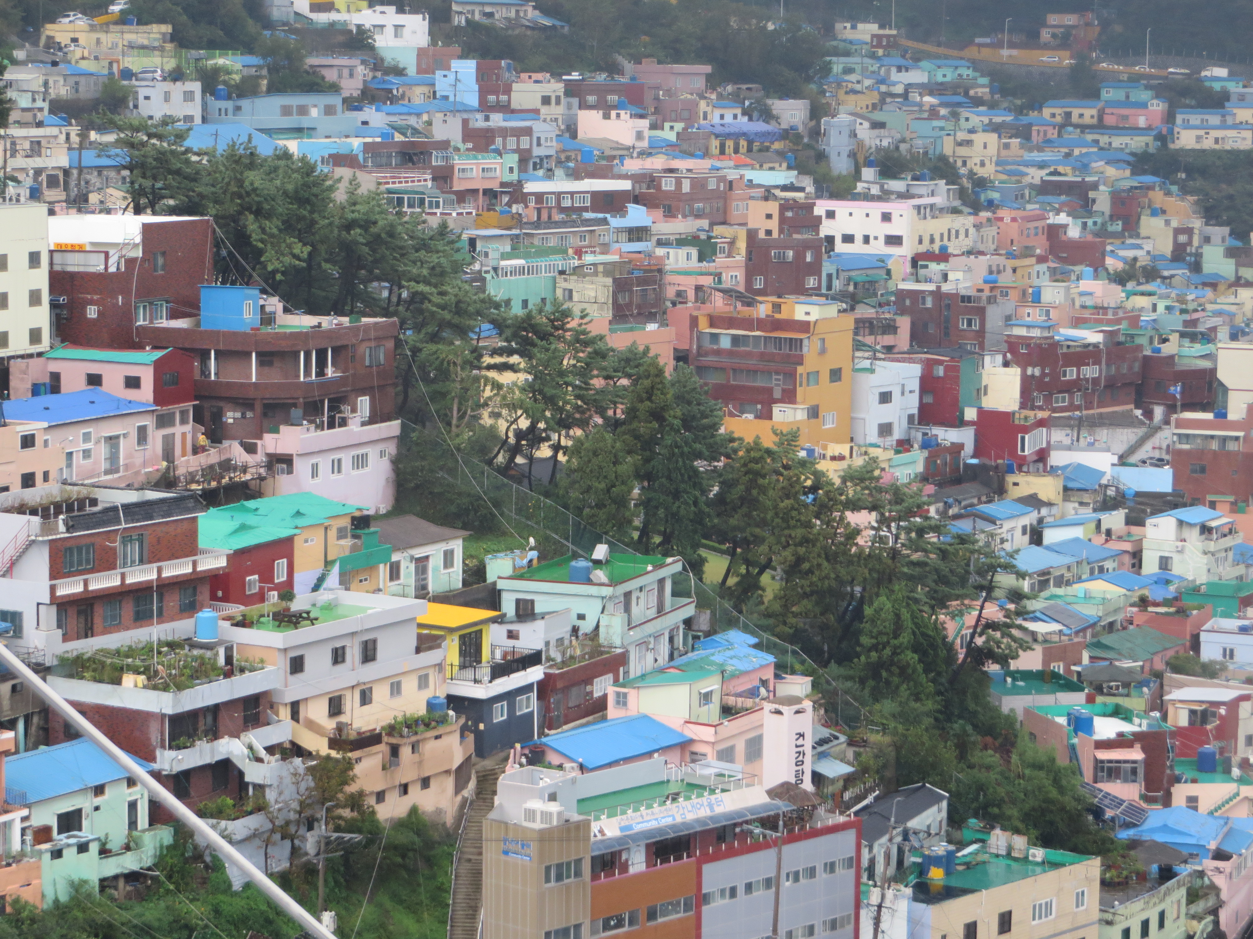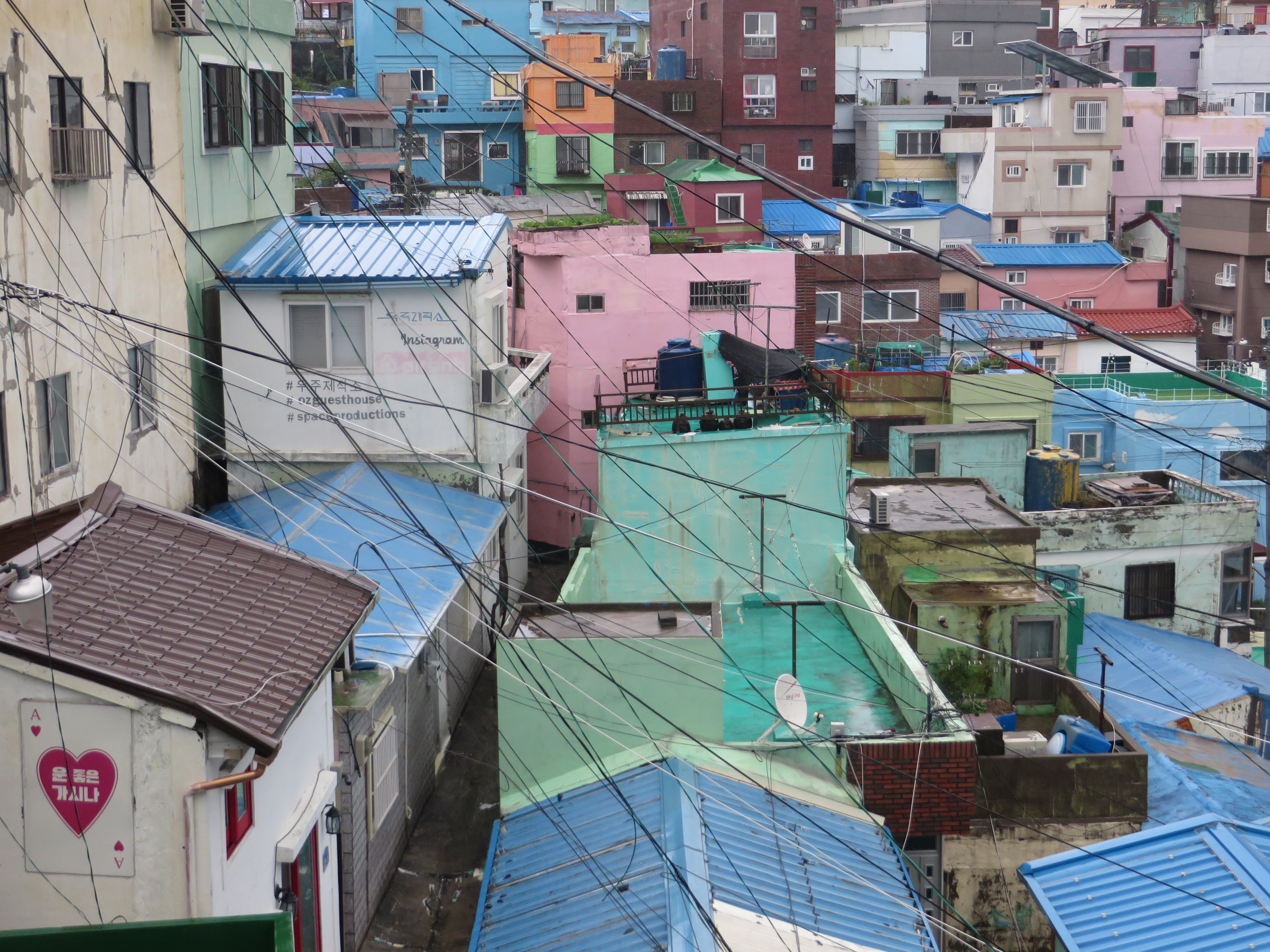 In Busan selbst schauten wir noch im Dorf Gamcheon vorbei. Die Ursprünge des Dorfes liegen im Koreakrieg. Damals hatten die nordkoreanischen Truppen fast das ganze Land erobert und viele Menschen flohen nach Gamcheon ganz im Süden. In den Nachkriegsjahren war die Gegend ein Slum. Das kann man sich heute noch gut vorstellen, denn die Häuser kleben am Berghang wie eine Favela in Rio de Janeiro.