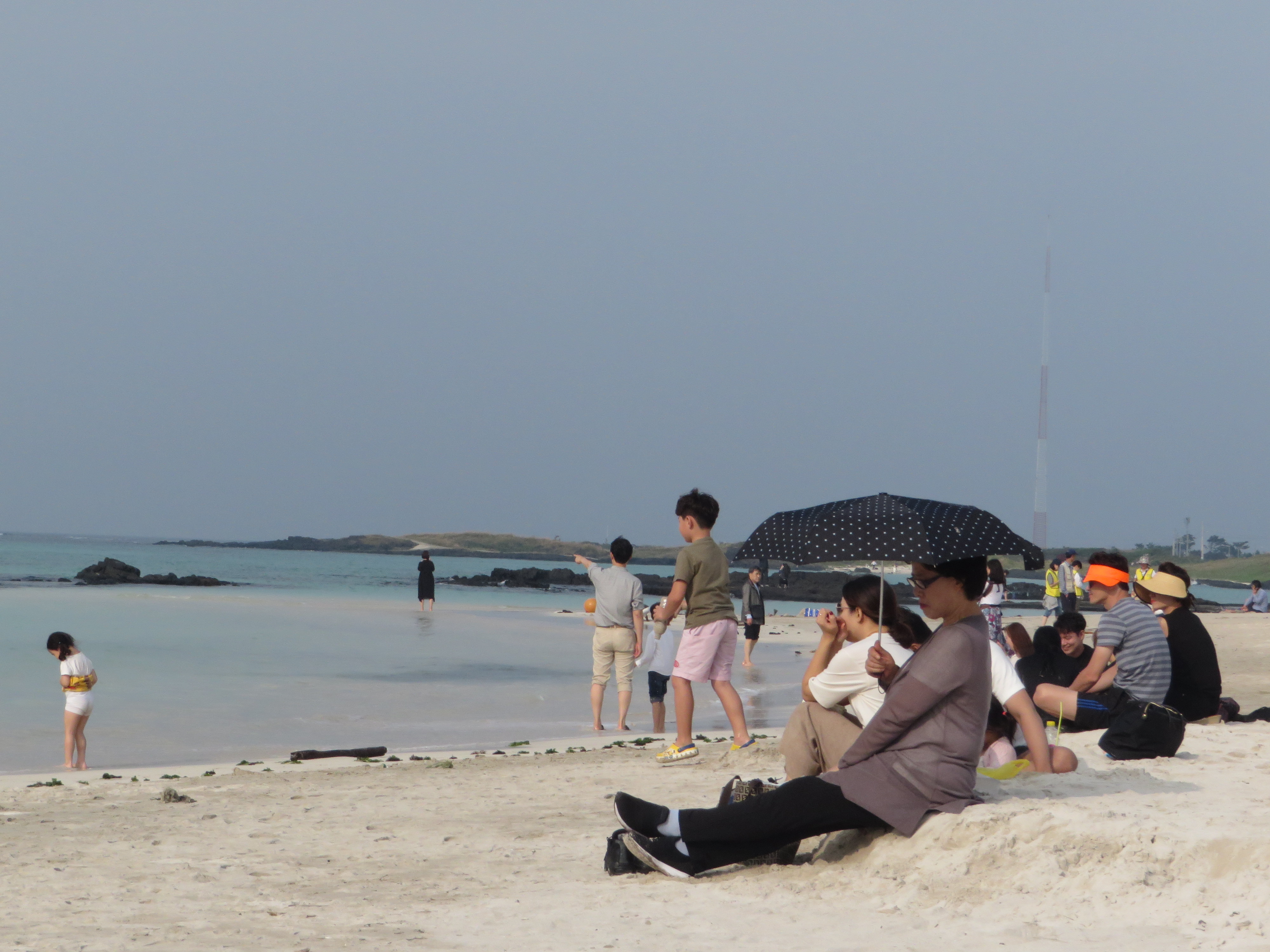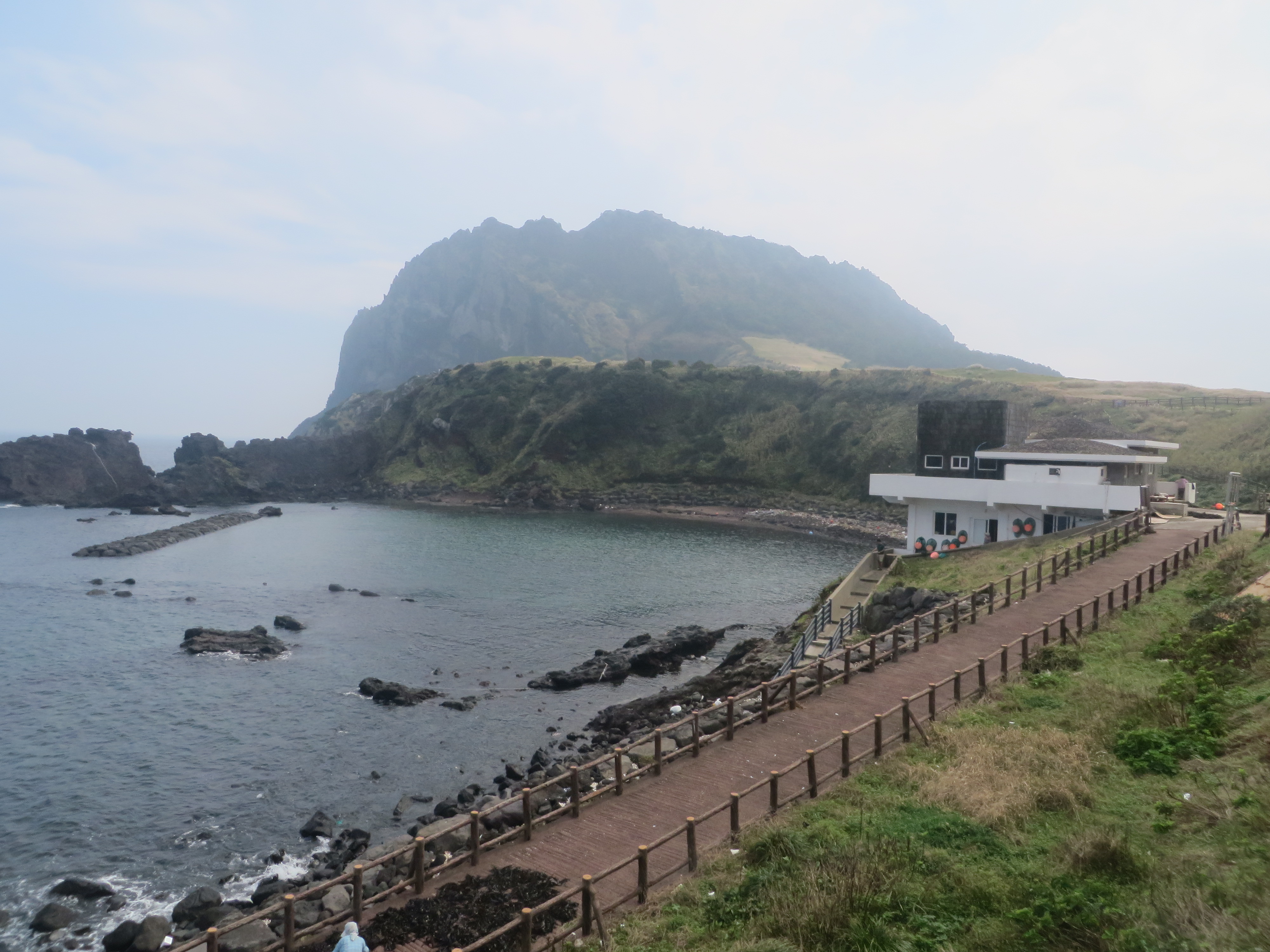 60 Vulkankegel sind über die Insel verteilt. Der Seongsan Ilchulbong ragt ins Meer hinaus und kann bestiegen werden. Die Koreaner sind begeisterte Wanderer und so zieht eine ganze Karawane den Berg hinauf.