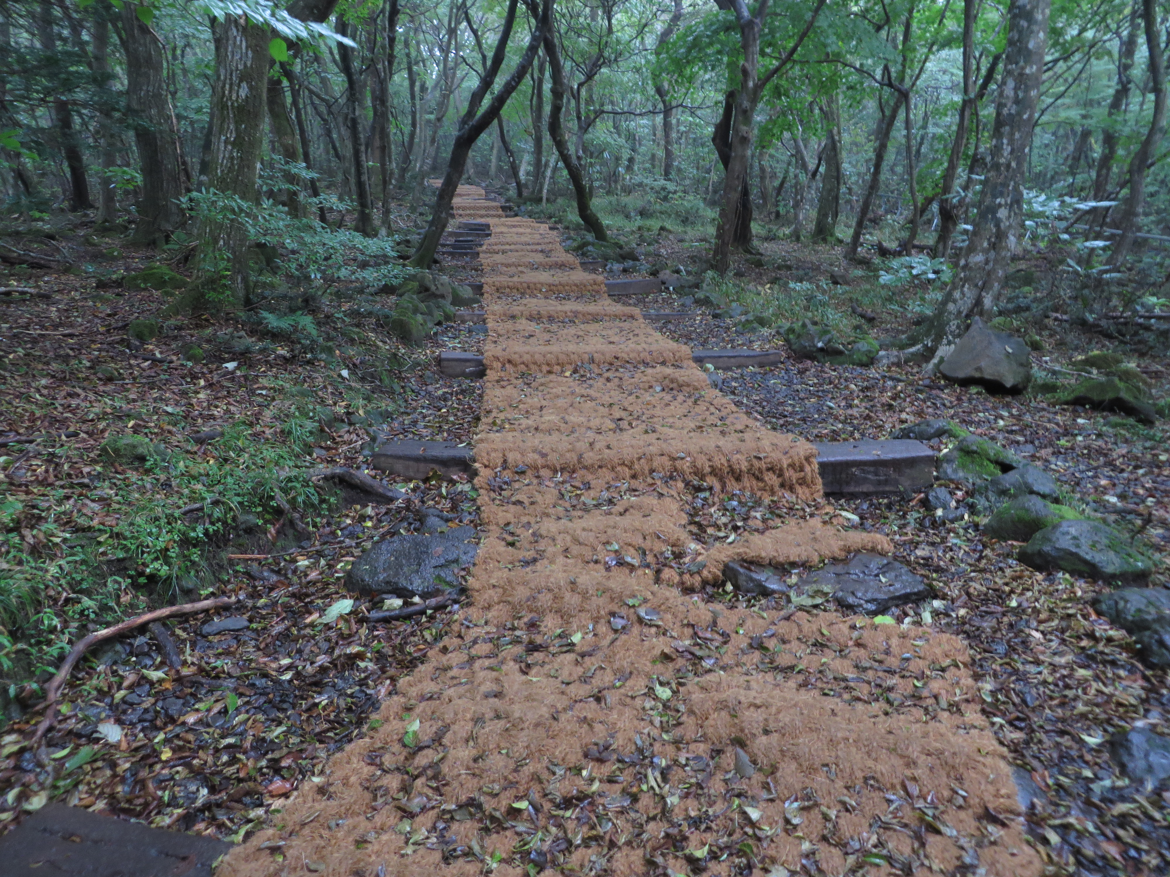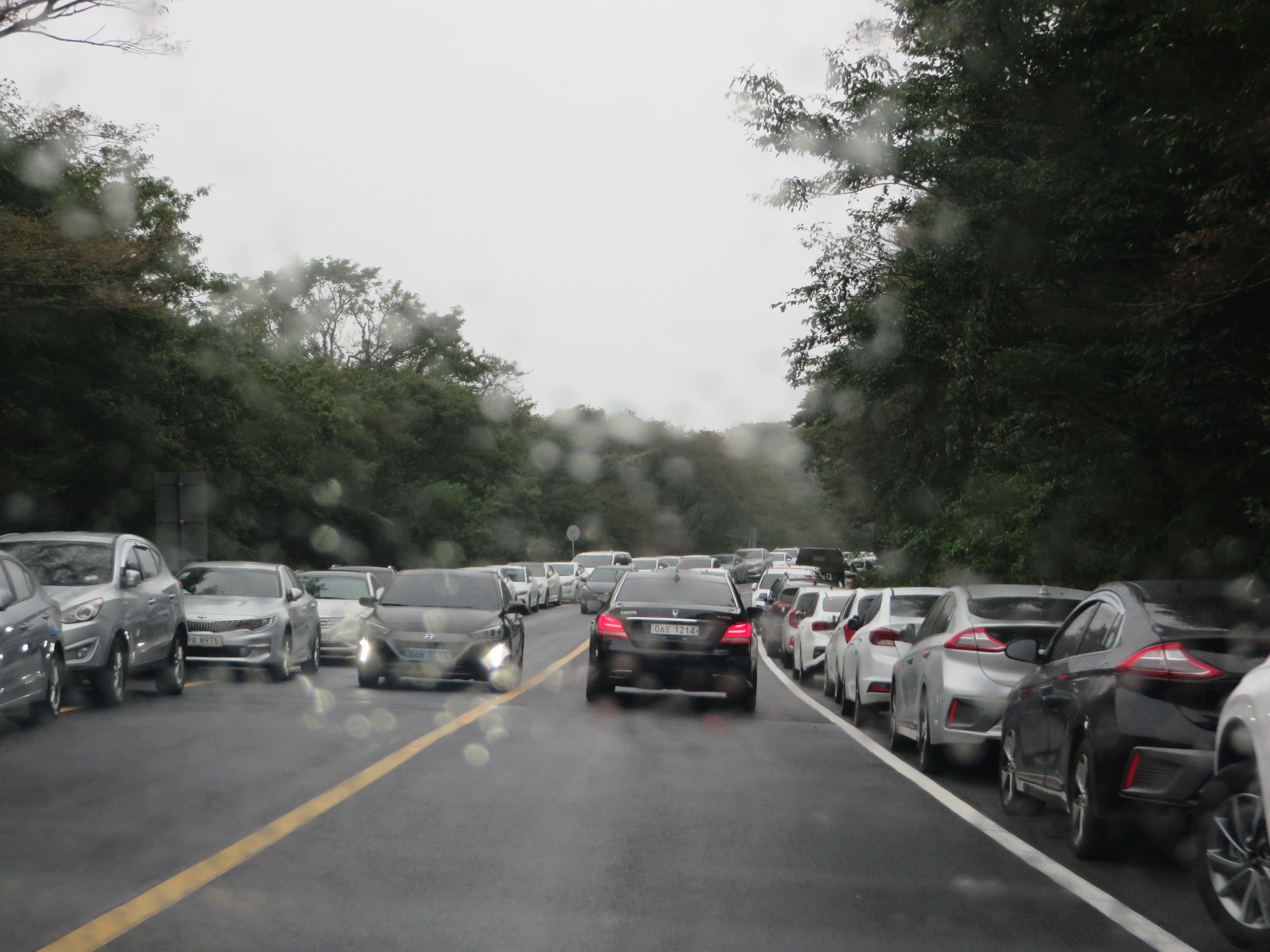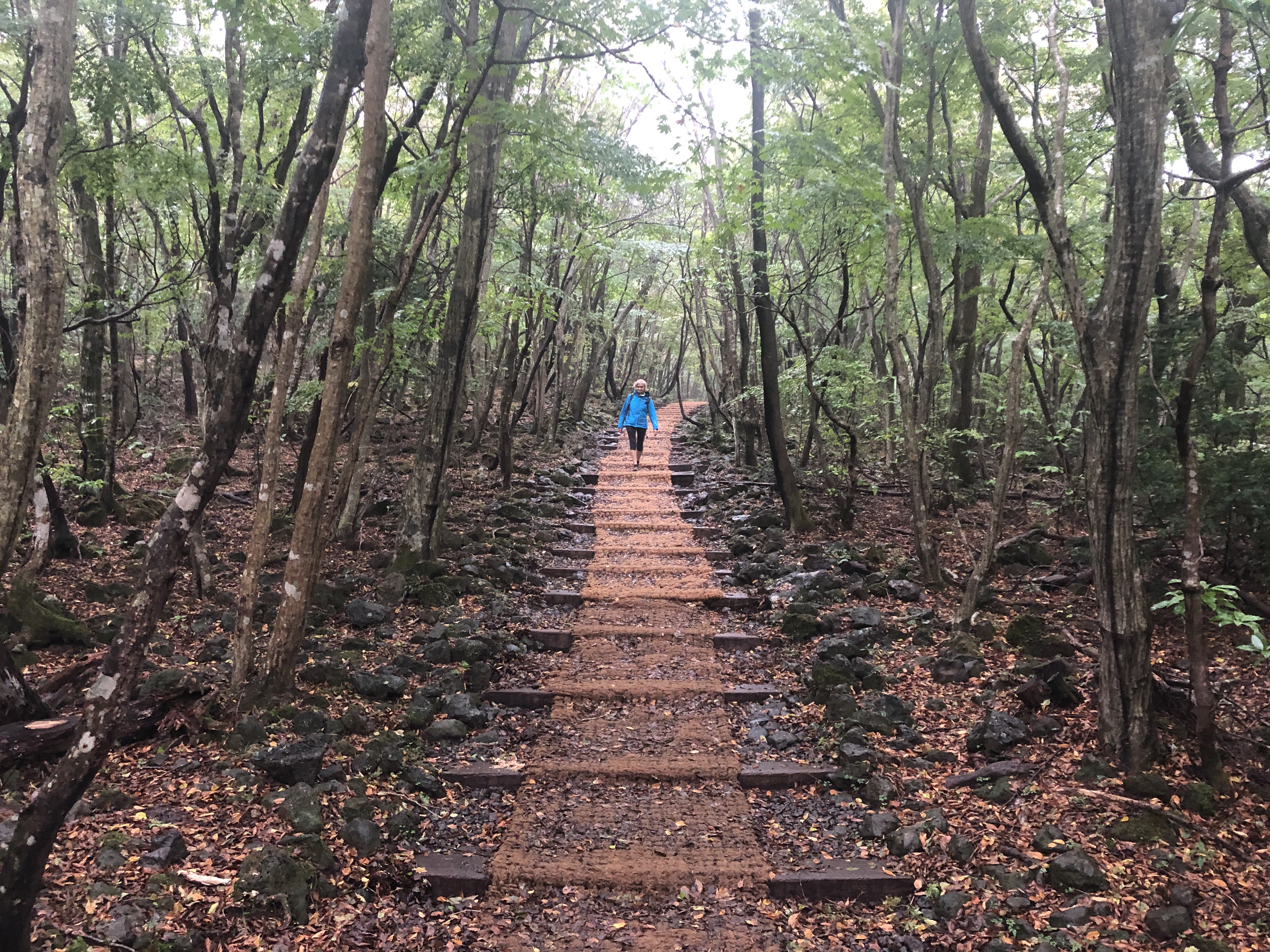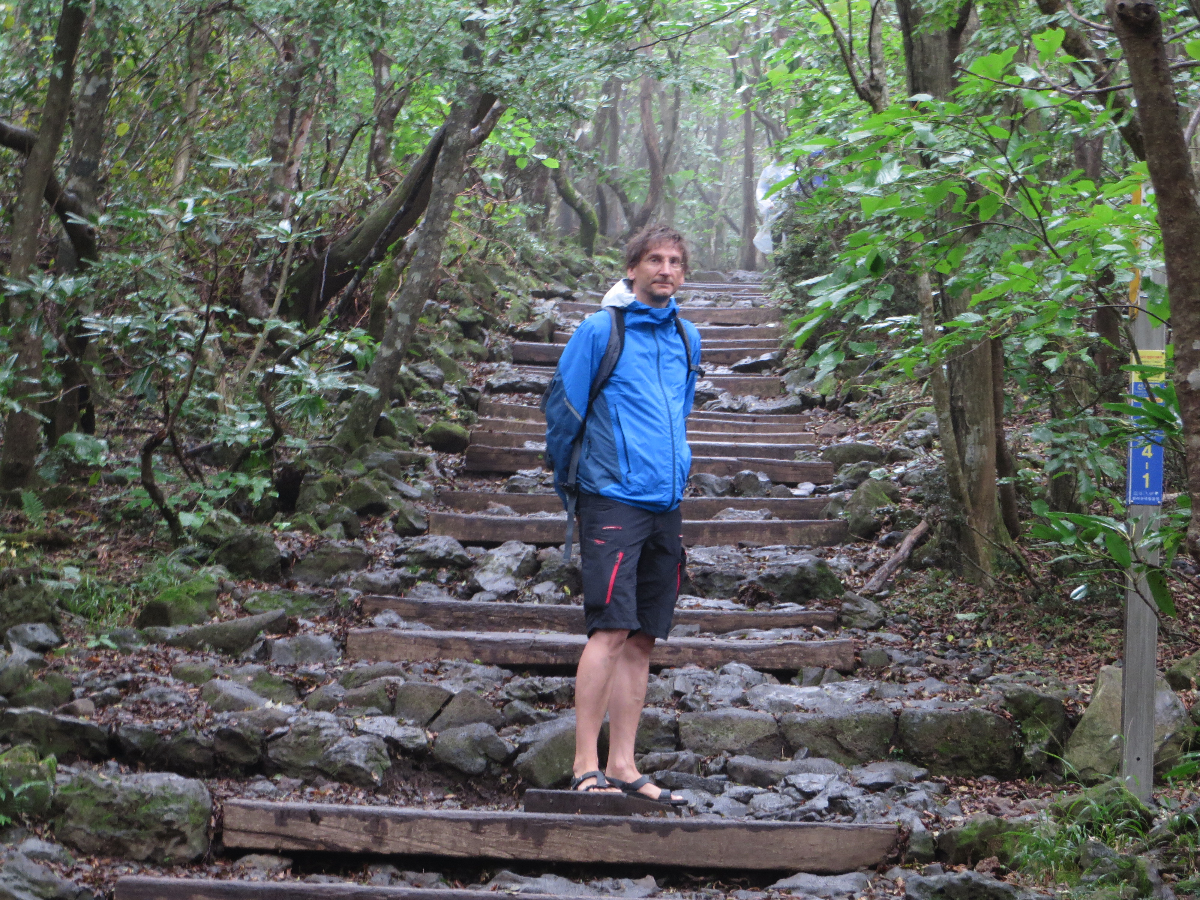 Der 1950 m hohe erloschene Vulkan Hallasan ist zugleich der höchste Berg Südkoreas. Er dominiert die Insel Jeju und ist normalerweise von überall aus zu sehen. Heute hüllte er sich aber in Nebel. Es war heute ziemlich feucht bis nass hier oben. Das kann aber die Koreaner nicht vom Wandern abhalten. Der Parkplatz hat nicht ausgereicht und so wurde kilometerlang entlang der Straße geparkt.