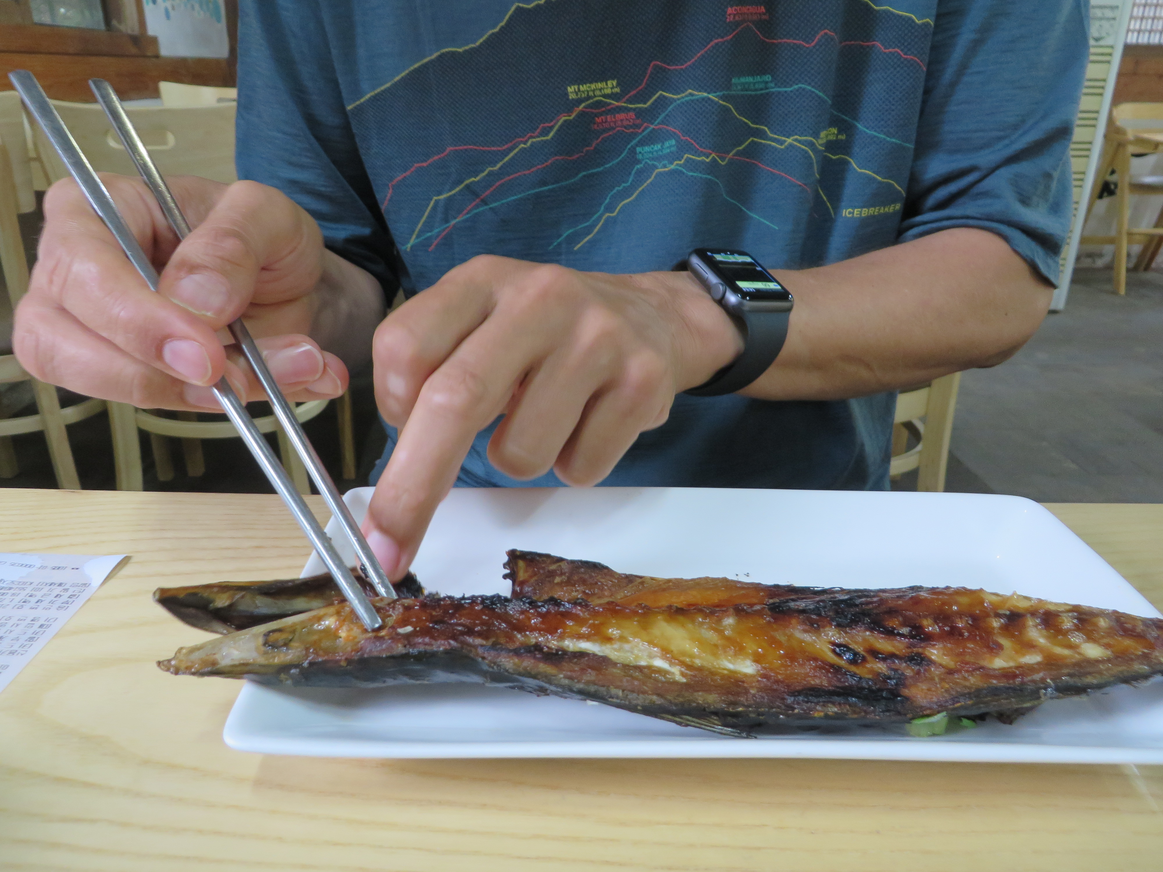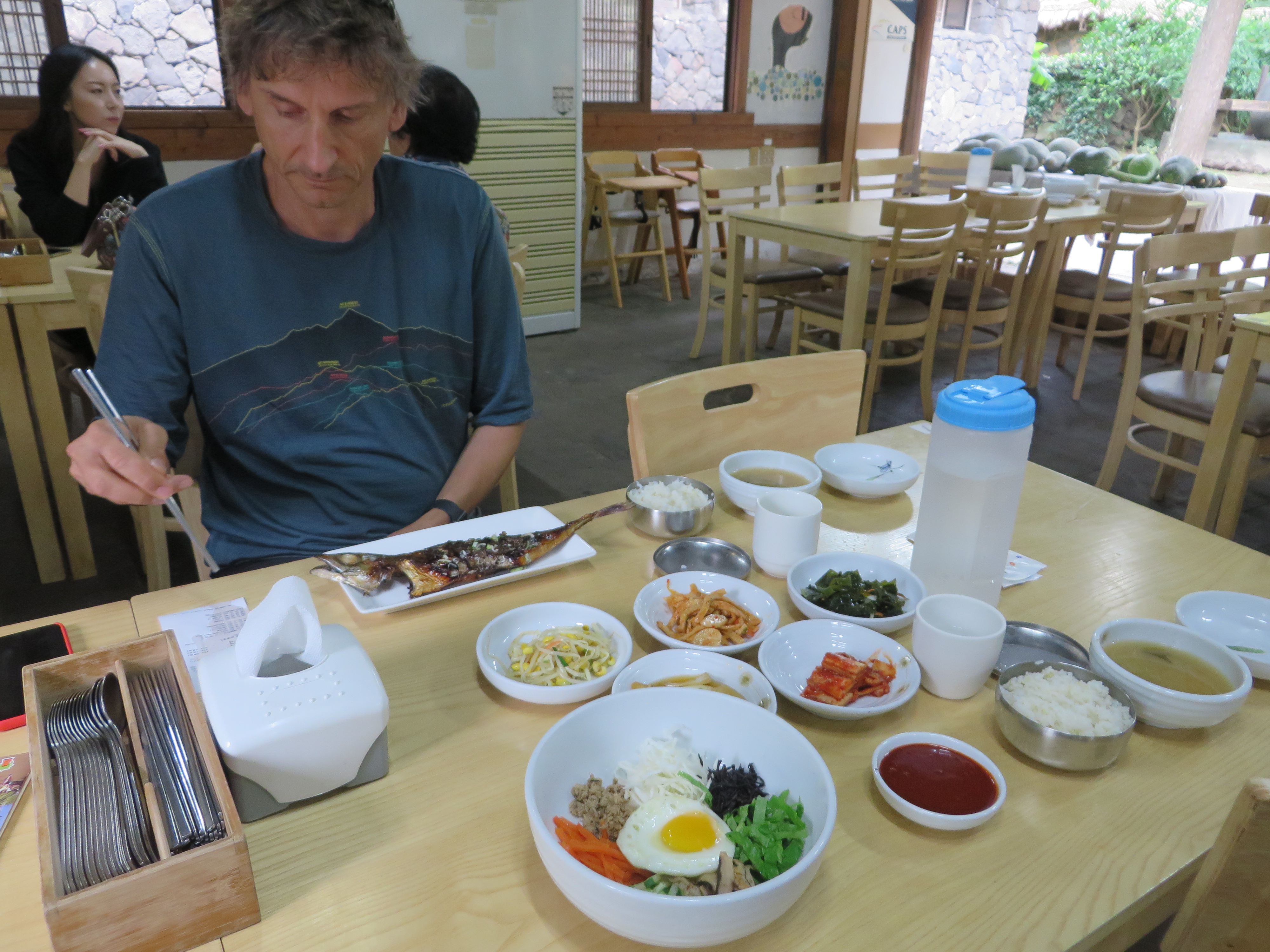 Hier gab es mal wieder Bibimbap. Alex hat sich eine Makrele bestellt und dann festgestellt, dass er die ja mit Stäbchen essen muss.