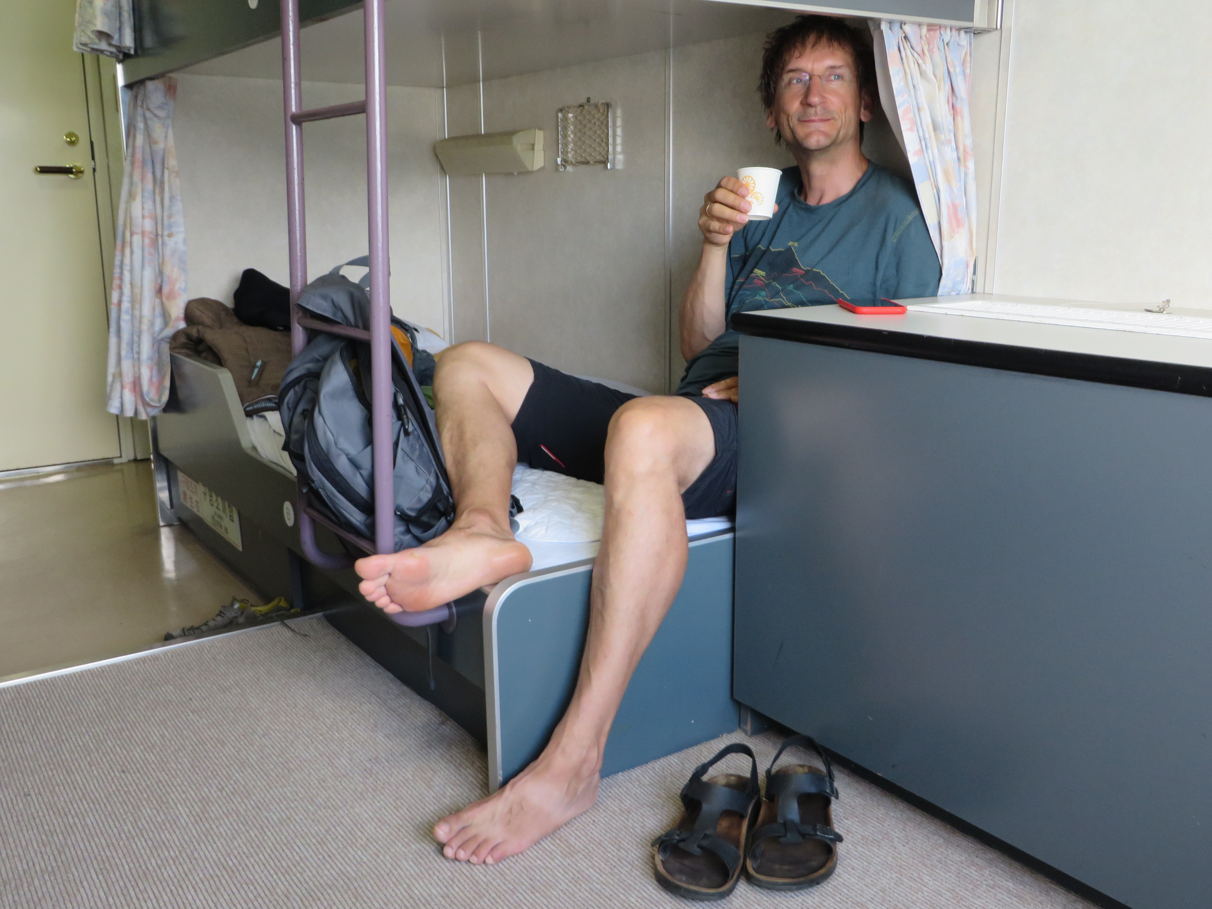 Wir hatten uns schon gewundert, dass das Schiff diesmal vier Stunden brauchen soll. Als wir am Terminal eincheckten, erfuhren wir, dass das Schiff nicht nach Wando fährt (von dort sind wir gekommen), sondern nach Jeosu, das viel weiter östlich liegt. Nach den angekündigten vier Stunden sahen wir immer noch keine Lichter am erwarteten Ufer. Da haben wir erfahren, dass das Schiff sechs Stunden fährt und erst um 22 Uhr ankommt. Dass wir eine 4-Bett-Kabine gebucht hatten und nicht mit 58 anderen Personen in einem Raum auf dem Boden sitzen mussten, war dagegen eine erfreuliche Überraschung.