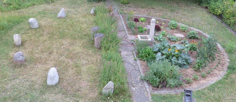 Als wir 2015 in England waren besuchten wir in Avebury den größten Steinkreis der Welt. Steinkreise sind mystisch. Sie erzählen vom Leben und den Kulten einer prähistorischen Kultur. Sie ziehen magisch an. Deshalb haben wir in unserem Garten auch einen angelegt. Die Steine ergänzen den Halbkreis des Gemüsegartens zu einem geschlossenen Kreis. Wir haben ihm den Namen Ehbury gegeben (Eh von Ehingen, bury von graben). In unserem Steinkreis zu sitzen ist besonders. Vor allem wenn zur Tag-und-Nacht-Gleiche ein Feuer brennt. Auch Wasser befindet sich im Kreis, Erde und Luft sowieso. Alle vier Elemente sind hier vereint.