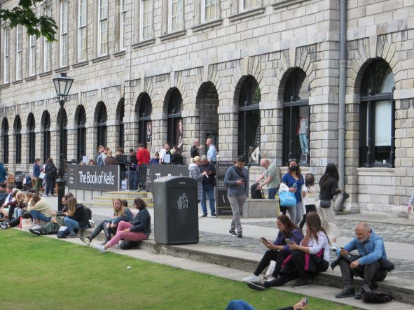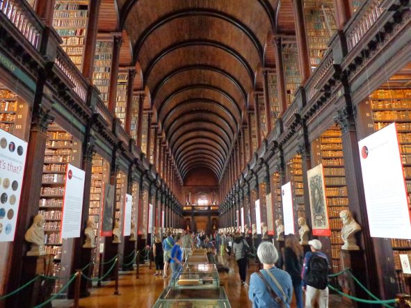 Die Alte Bibliothek war leider ausgebucht. Um sie zu sehen, hätten wir schon früher Karten kaufen müssen. So konnten wir uns auch nicht das weltberühmte und kostbare Book of Kells ansehen. In der schönsten Prunkschrift der Welt stehen auf 680 überschwänglich gestalteten Seiten die vier Evangelien. Entstanden vermutlich um 800, im Jahr 1007 in einer Kirche in Kells gefunden.