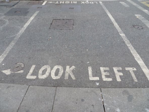 Bei Fußgängerüberwegen steht am Boden ein Hinweis, in welcher Richtung man unbedingt auf den Verkehr achten muss. Das ist übrigens auch in England so. Kommen sie mit dem Linksverkehr selber durcheinander?