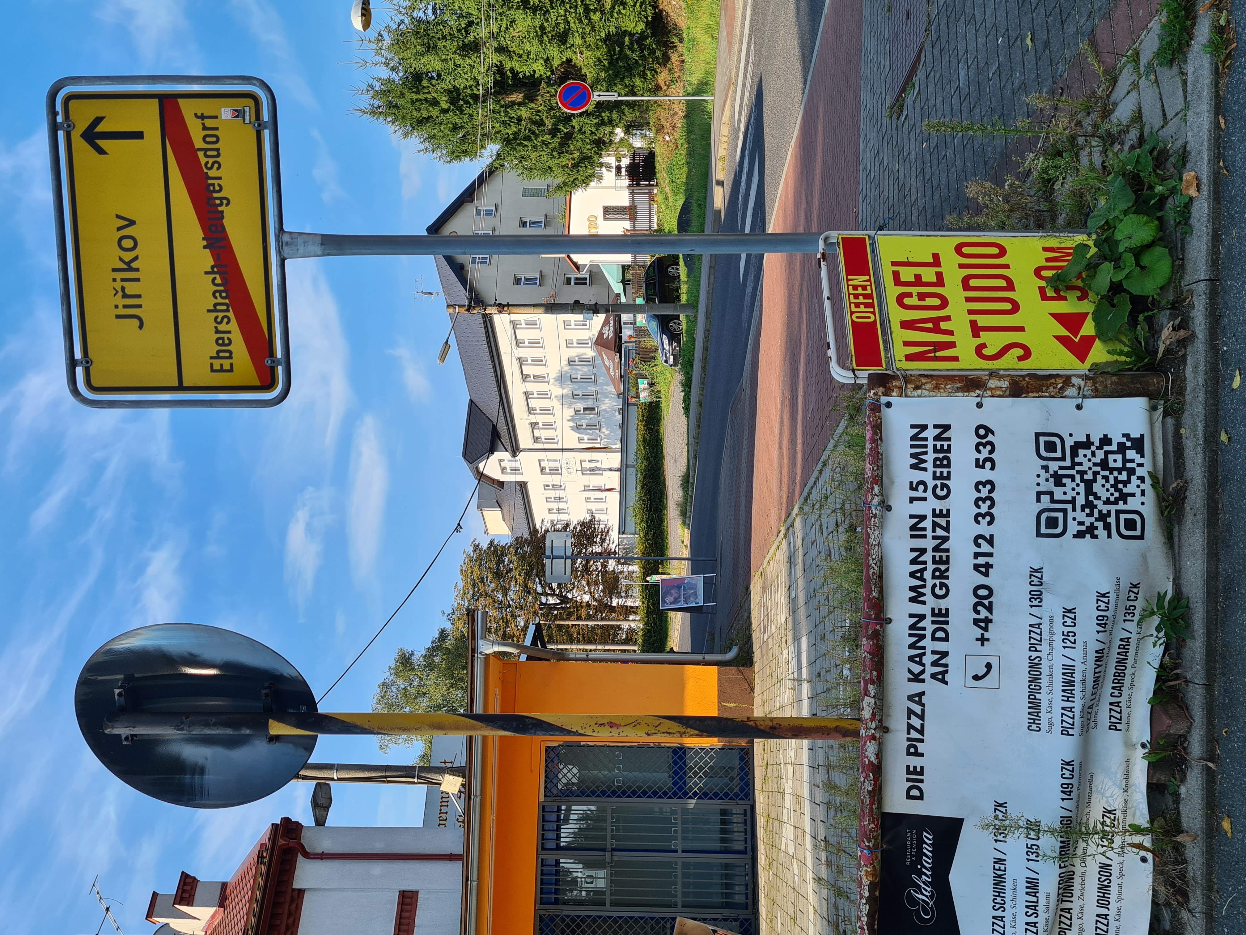 Ebersbach ist mit Jirikov in Tschechien verbunden. Auf dem Schild ist zu lesen, dass man sich im Gasthof Adriana in Tschechien eine Pizza bestellen und hier an die Grenze liefern lassen kann 😅