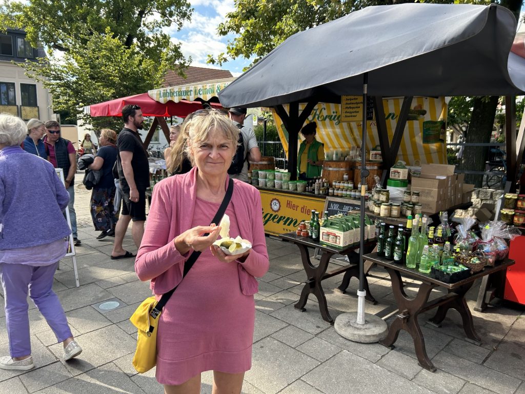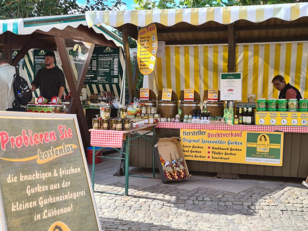 Wir haben eine Gewürzgurke und eine Senfgurke aus dem Fass probiert. Es gibt noch Saure Gurken, Meerrettichgurken, Knoblauchgurken, Chiligurken. Und Gurkenlikör. Den haben wir auch getestet.