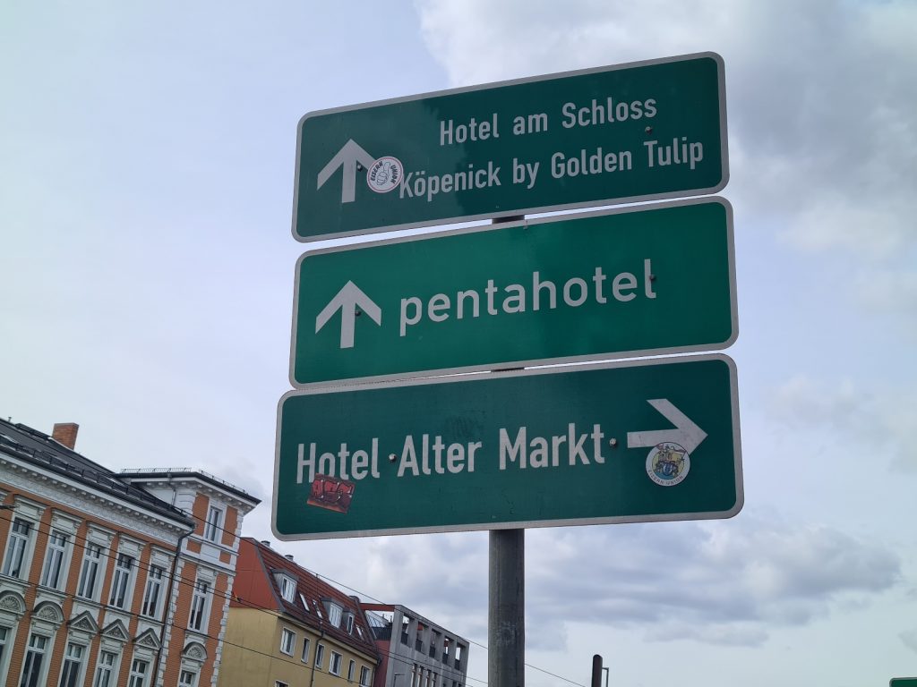 Es gibt noch einen weiteren Grund um hier zu bleiben in Berlin-Köpenick. Alex verbrachte hier vor einigen Jahren viele Wochen und Monate. Eine komplizierte Sortieranlage musste aufgebaut und in Betrieb genommen werden. Das Pentahotel war damals sein Zuhause. Auf dem Straßenschild steht es noch,