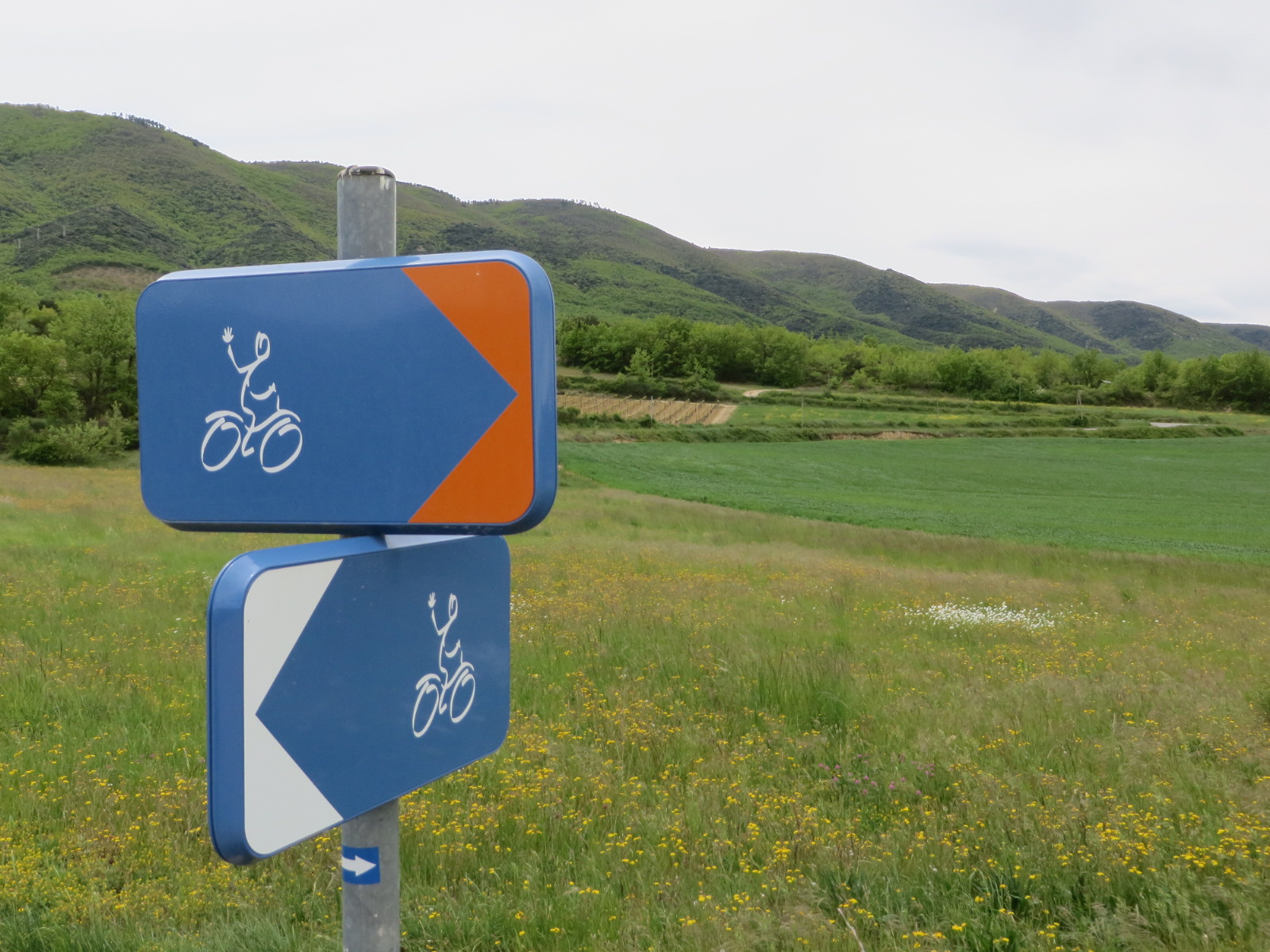 Die heutige Etappe führte über den höchsten Punkt der Tour du Luberon. Nein, hier blüht nicht der Lavendel, sondern Thymian. Der Lavendel blüht erst im Juni. Dann muss es Wahnsinn sein, hier zu radeln, wenn der schwere Lavendelduft in der Luft hängt. Weiter oben wachsen nur noch sehr ausdauernde Pflanzen an den windgepeitschten Hängen. Niederwüchsige Bäume mit Eichenblättern trotzen dem Klima. Bergeichen? Was folgt nach dem höchsten Punkt? Eine schöne lange Abfahrt. Hier vorbei an Reillanne. Diesem orangefarbenen Schild folgen wir auf unserer Tour (und natürlich dem Navi von Alex ☺). Das weiße Schild führt in die entgegengesetzte Richtung. Dreimal sind uns bisher Reiseradler begegnet. Im Hintergrund ist der Luberon…