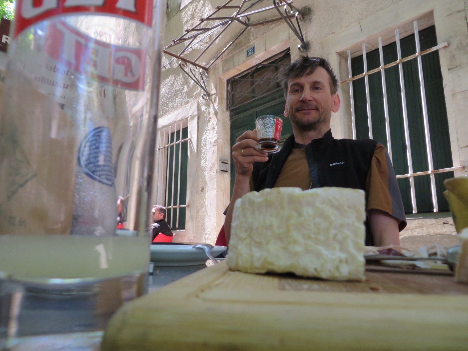 Unsere heutige Route von Arles nach Salon-de-Provence führt im Süden an den Les Alpilles entlang, einem kleinen Bergrücken mit Kalkfelsen. Gemüse aus Südfrankreich habe ich mir in der Sonne gereift vorgestellt. Aber wir fahren immer wieder an vielen, vielen Gewächshäusern vorbei. Heute ca. einen Kilometer lang. Der alte Renault R4 fährt hier immer noch rum. In Mouries war heute Markttag und auch in den Cafés viel los. Wir setzten uns dazu und wollten was trinken. Alex bestellte kleine Brötchen, die er am Nachbartisch gesehen hatte, aber es ist irgendetwas schief gelaufen und die nette Bedienung brachte uns eine große Brotzeitplatte. Der Biobäcker, bei dem ich ein paar Bisquits gekauft hatte,…